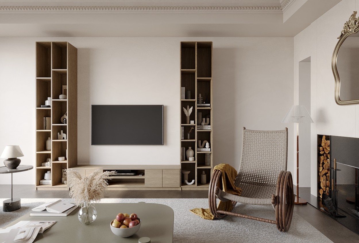 In this residence, integrated storage was designed as part of the architectural language, not an applied layer. Vertical shelving frames the space. Warm wood tones soften the geometry. Indirect lighting defines depth and calm.